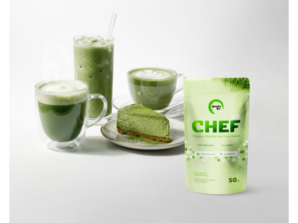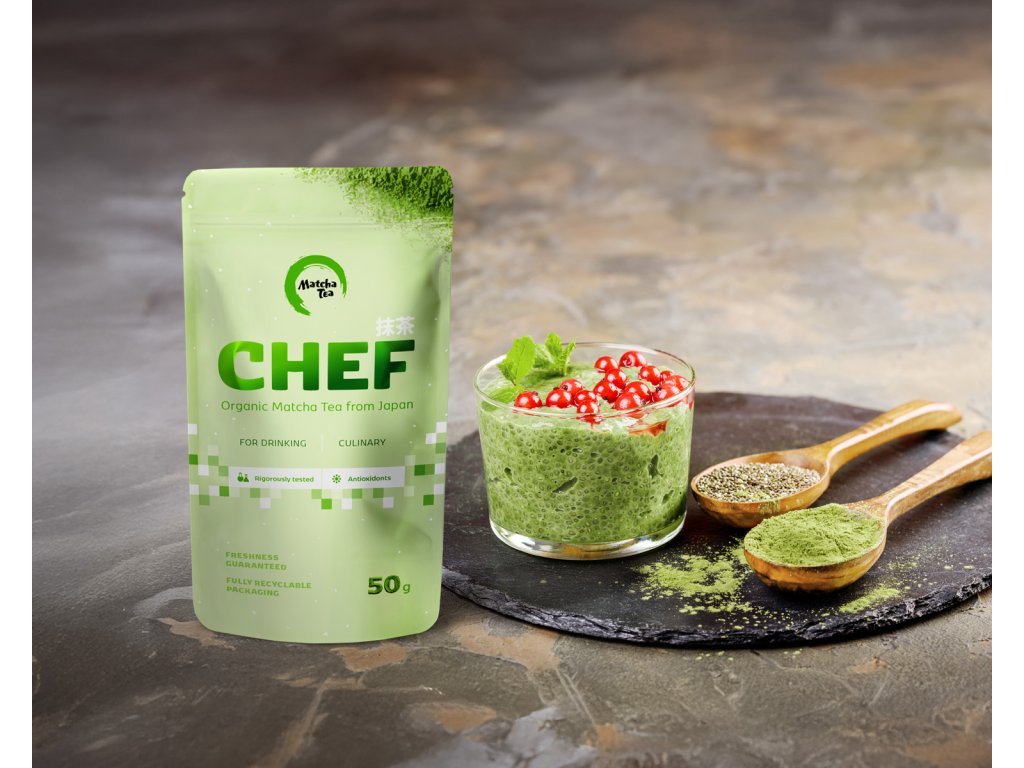 Chef je matcha vytvorená špeciálne na varenie a pečenie. 50g sypané balenie s odmerkou — stačí 1 čajová lyžička (≈ 2 g) do receptu. Dodáva jedlám živú zelenú farbu, jemnú matcha chuť a vôňu. Ideálna do koláčov, palacinkiek, smoothie aj zmrzliny.