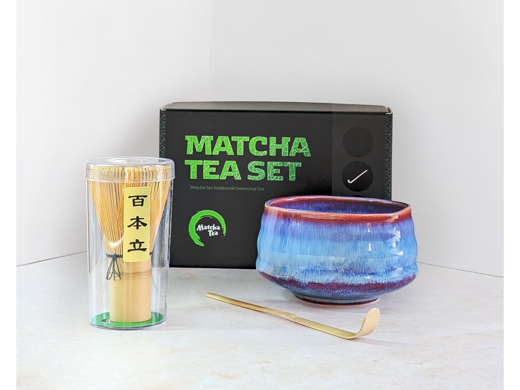 Kompletná sada na tradičnú japonskú prípravu matcha. Obsahuje ručne robený chawan Goro (ručne robený v zeleno-krémovom prevedení, viacero farebných variácií), bambusovú metličku chasen (80 prútikov) a Bio Matcha Tea Ceremony 30 g v plechovej dóze. Všetko, čo potrebujete na autentický japonský čajový zážitok.